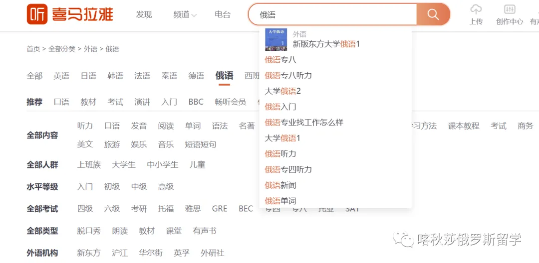 这个软件的适用性很强,里面有很多免费的俄语听力资源,有简单的,也有难的。进入软件中,搜索俄语,你可以看到各种俄语听力素材,像我们的大学教材“大学俄语”,俄语专八真题听力,还有各种日常口语短句,旅游常用句应有尽有。你想要的最正宗的俄语发音,最适合的俄语练习材料在这里都能找到。小编觉得你如果把这里面的听力都听熟并且掌握其中的知识点,那你俄语的听力水平一定是不可小觑的。喜马拉雅的网页版,APP版都可以用哦~