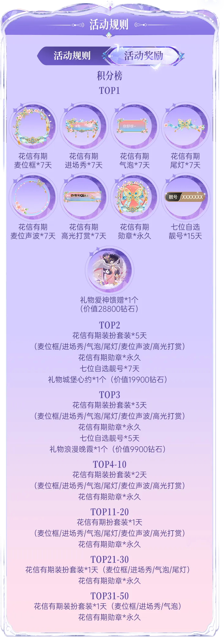 4、在聊天室内赠送/收到或者通过活动页面参与【花信有期】盲盒玩法均可完成点亮礼物卡牌图鉴,每完成一轮礼物卡牌图鉴的点亮可以获得【流光漱蕊麦位框*1天】,每一期最多可获得30次,同时部分礼物完成指定次数的卡牌图鉴点亮可获得额外奖励