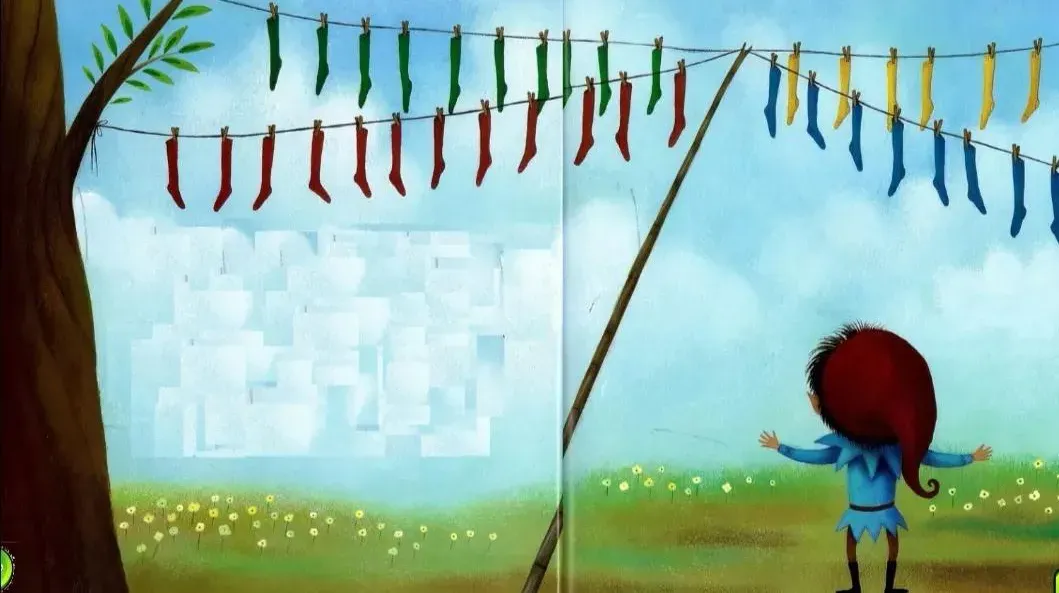 嘟嘟来到后院,发现这里挂满了袜子,它们都按照颜色分别整齐地挂在不同的晾衣绳上,红色一排,黄色一排,绿色一排,蓝色一排,每根晾衣绳上的袜子都是那么整齐有序。仿佛是一排排五彩的旗帜在空中飘扬。
