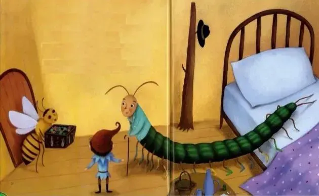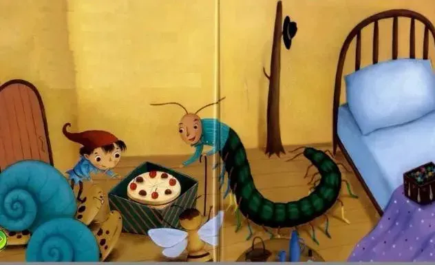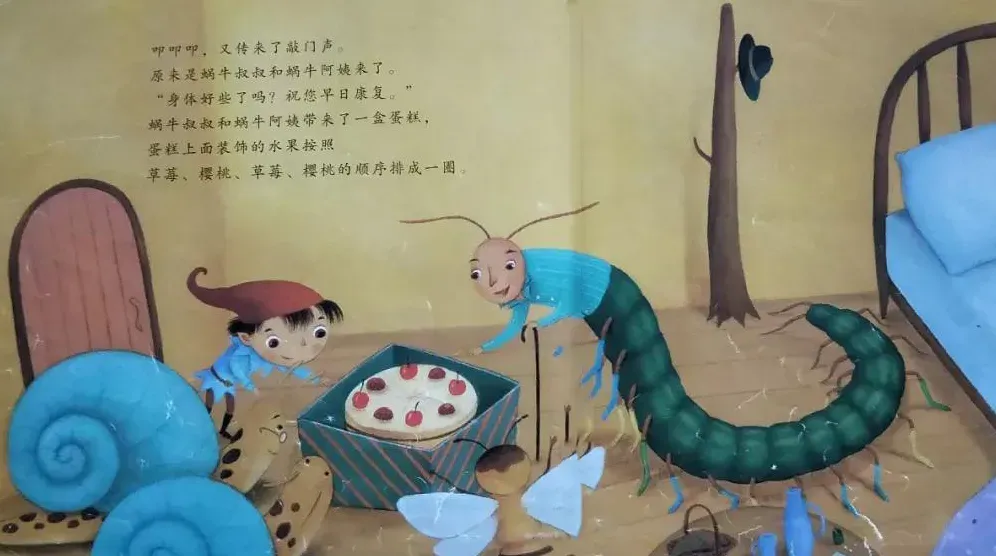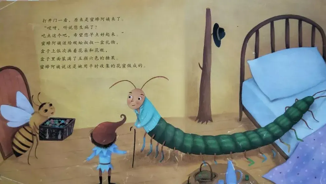 “哎呀,听说您病了?吃点这个吧,希望您早点好起来。”蜜蜂阿姨送给蜈蚣叔叔一盒礼物,盒子上依次画着花朵和花瓶,盒子里面装了五颜六色的糖果。蜜蜂阿姨说这是她用平时收集的花蜜做成的。