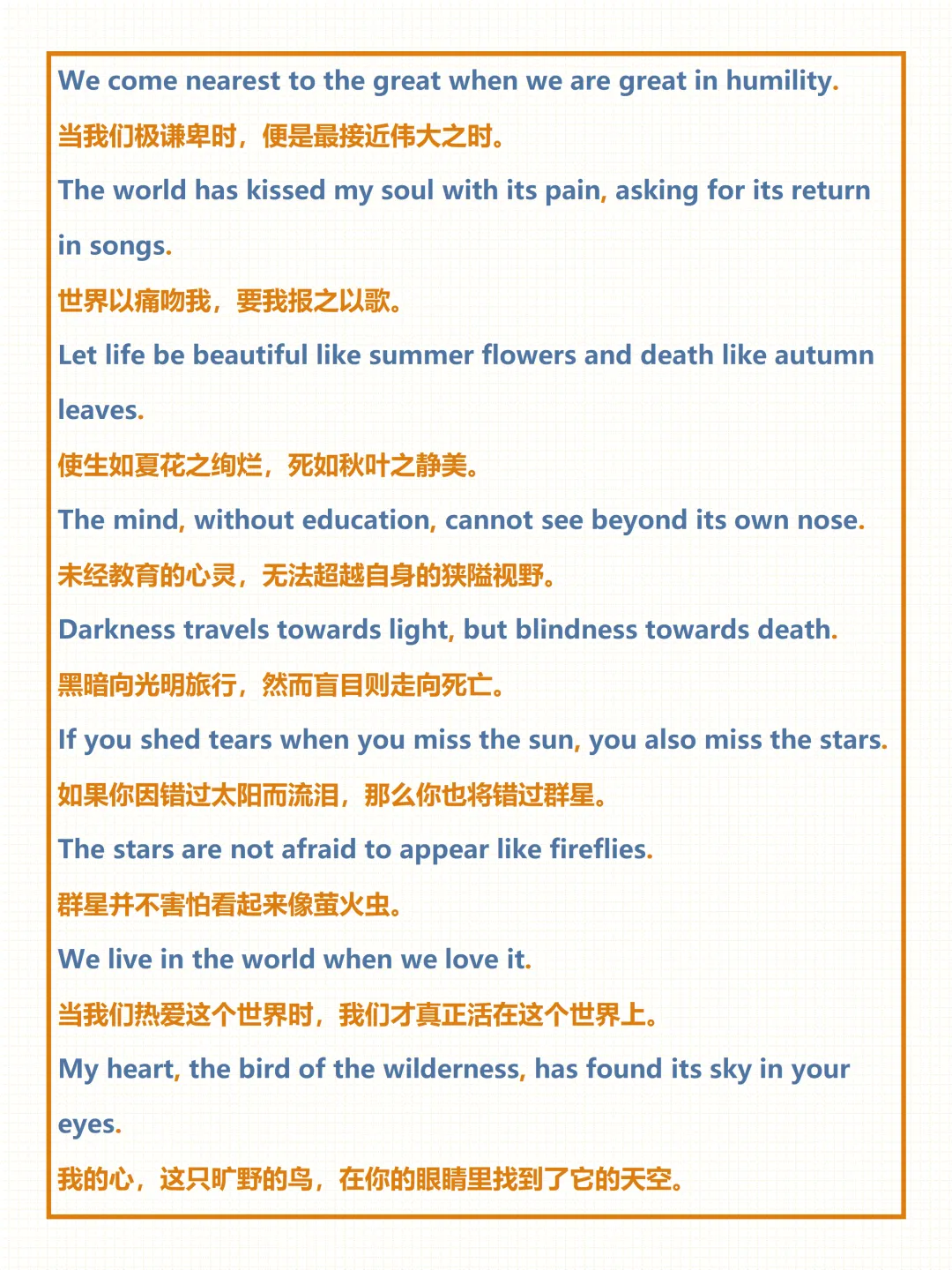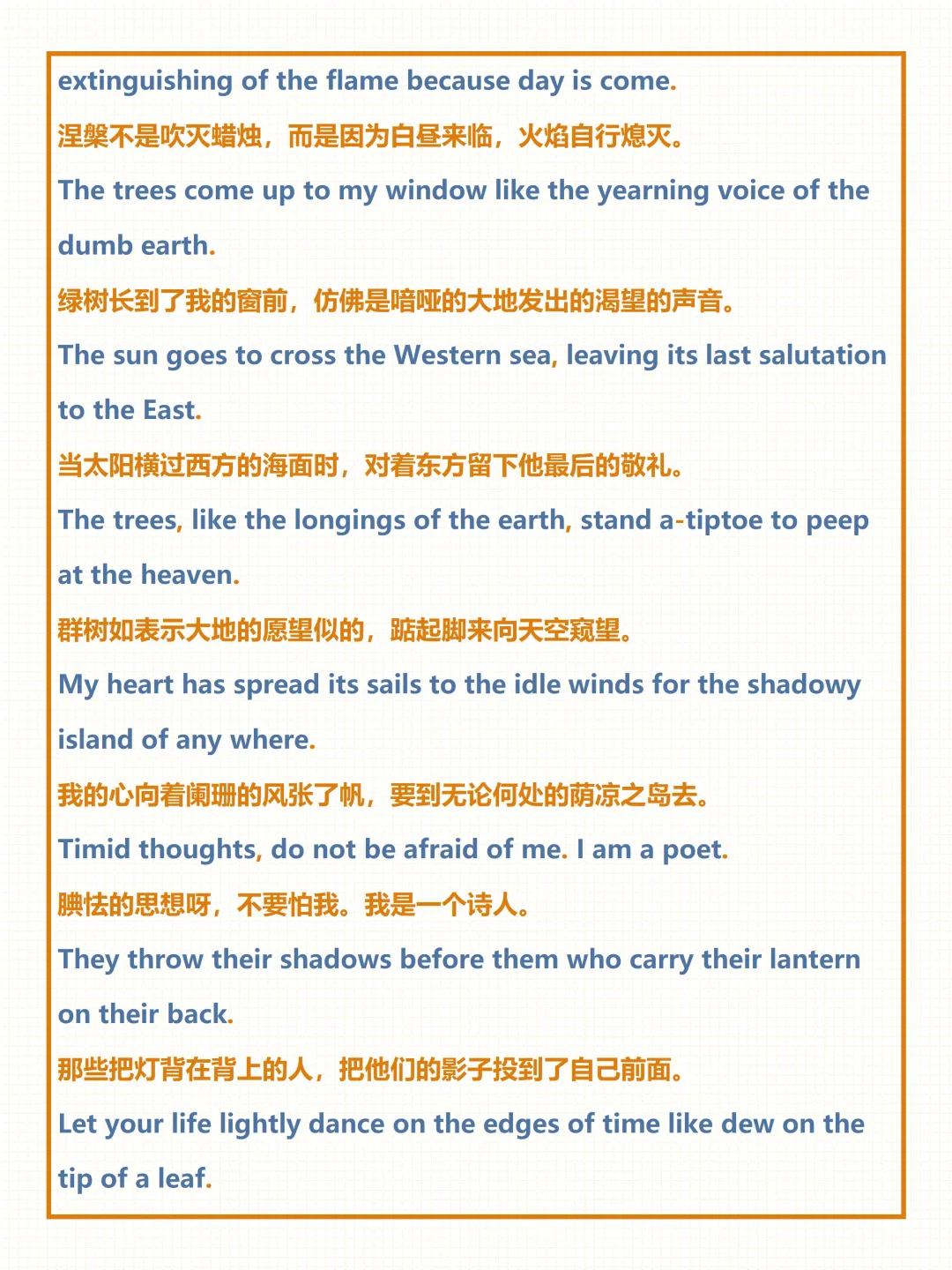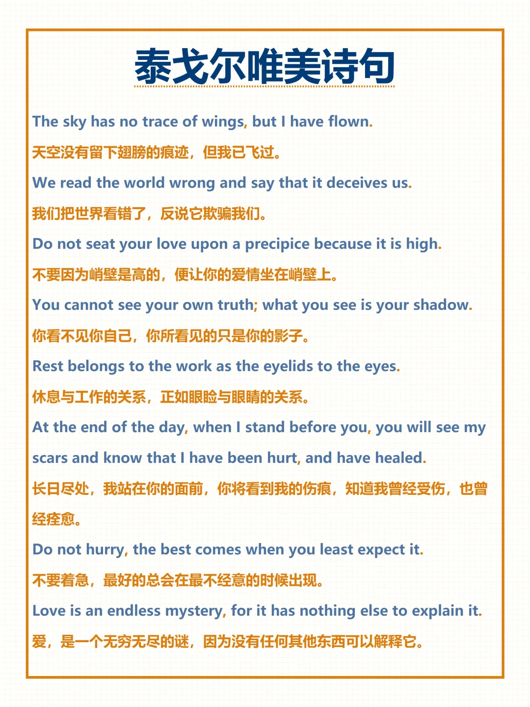 今天给大家整理了中考必备的【泰戈尔唯美诗句】,覆盖自然、亲情、奋斗等全场景常考话题,附详细例句与中文翻译,不管题目如何变式,都能精准应对,轻松拿下高分!