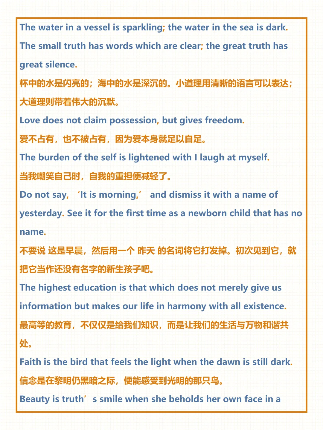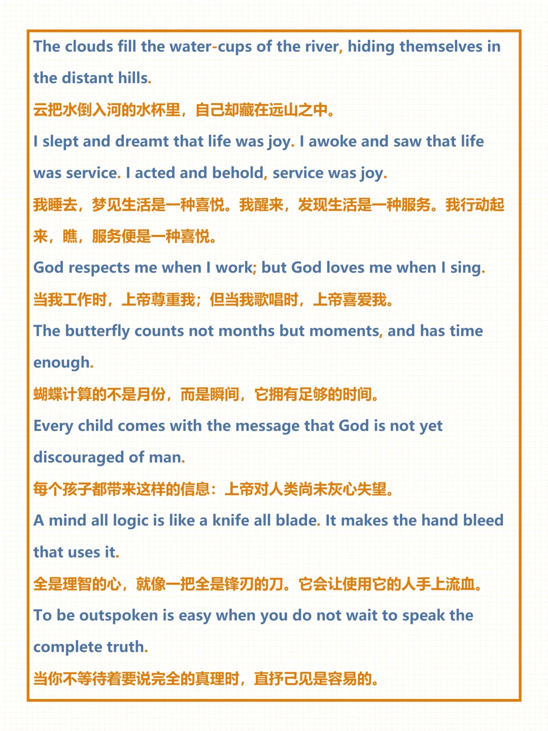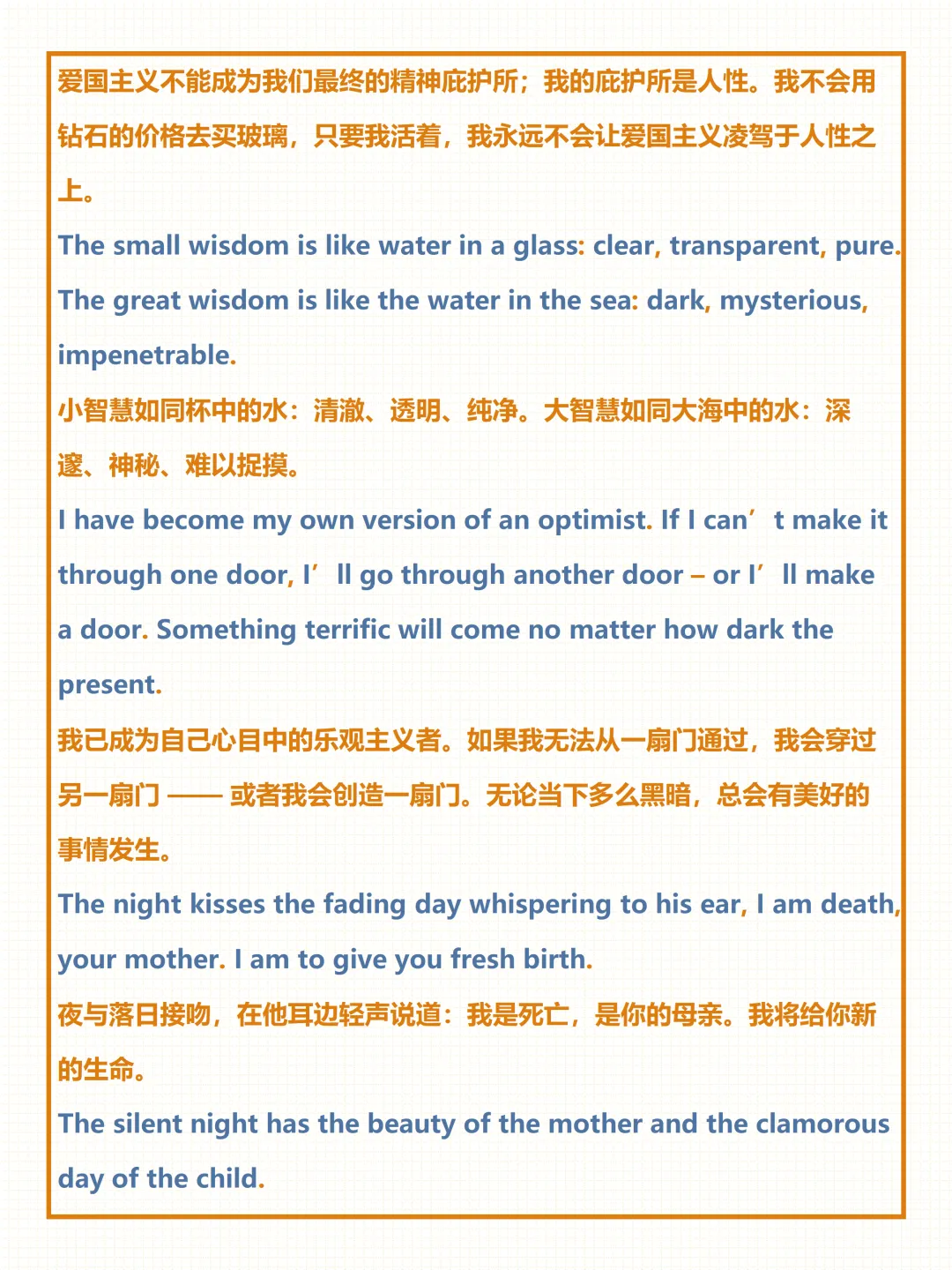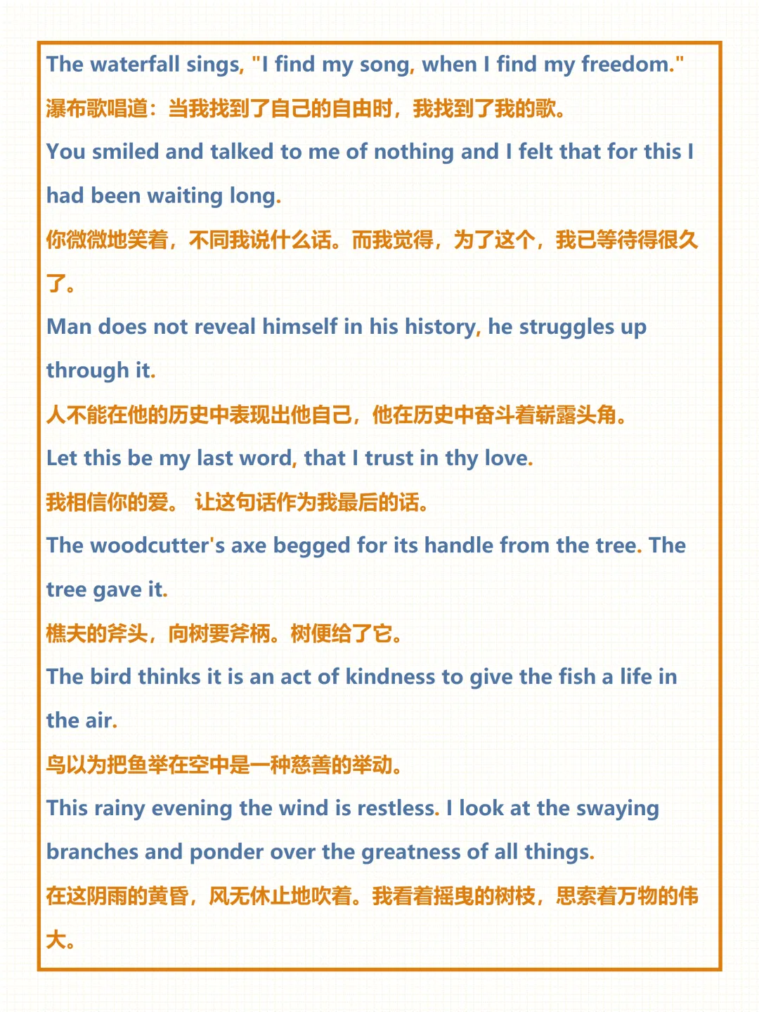 今天给大家整理了中考必备的【泰戈尔唯美诗句】,覆盖自然、亲情、奋斗等全场景常考话题,附详细例句与中文翻译,不管题目如何变式,都能精准应对,轻松拿下高分!