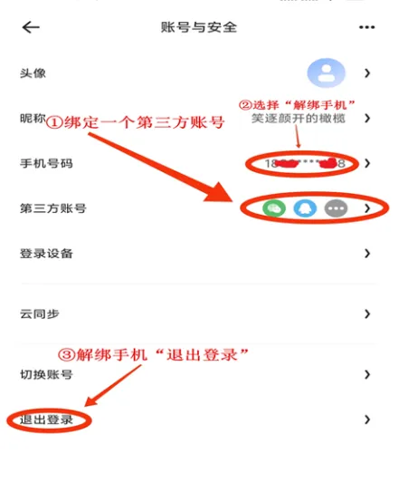 ③解绑手机后,选择“退出登录”。