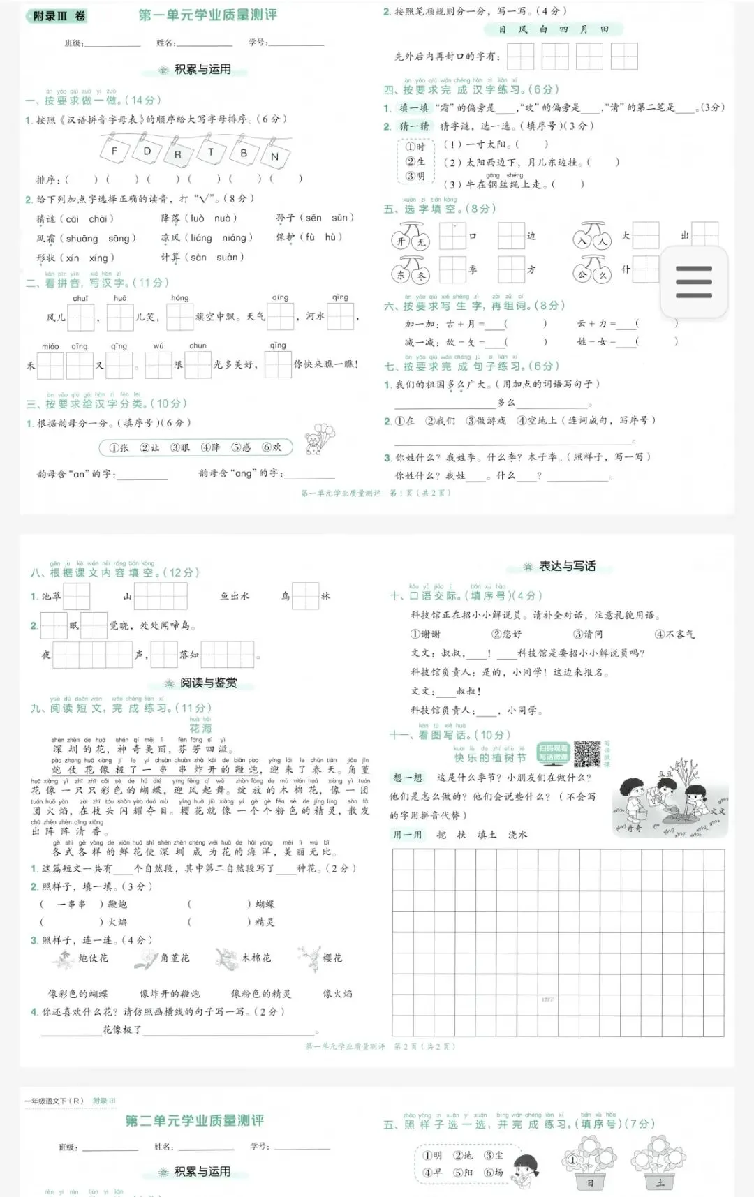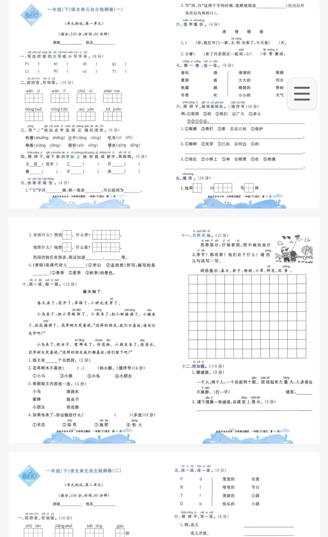 【小学语文试卷】2026年春人教部编版语文1年级下册单元试卷测试卷及答案含期中期末综合素养评价试卷高清pdf电子版(多套)