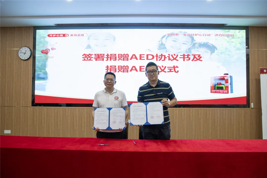 4月10日中午,一场充满温情与责任的公益行动在惠东县综合实验学校暖心上演 —— 惠州市校园安全教育与管理服务协会向学校捐赠自动体外除颤器(AED)设备一台,并联合公共急救培训中心开展了专业的心肺复苏术(CPR)与 AED 操作技能培训。惠东县综合实验学校初中部副校长邹庆胜与协会副会长李洪斌现场签署捐赠协议,为校园应急救护体系建设筑牢关键一环。
