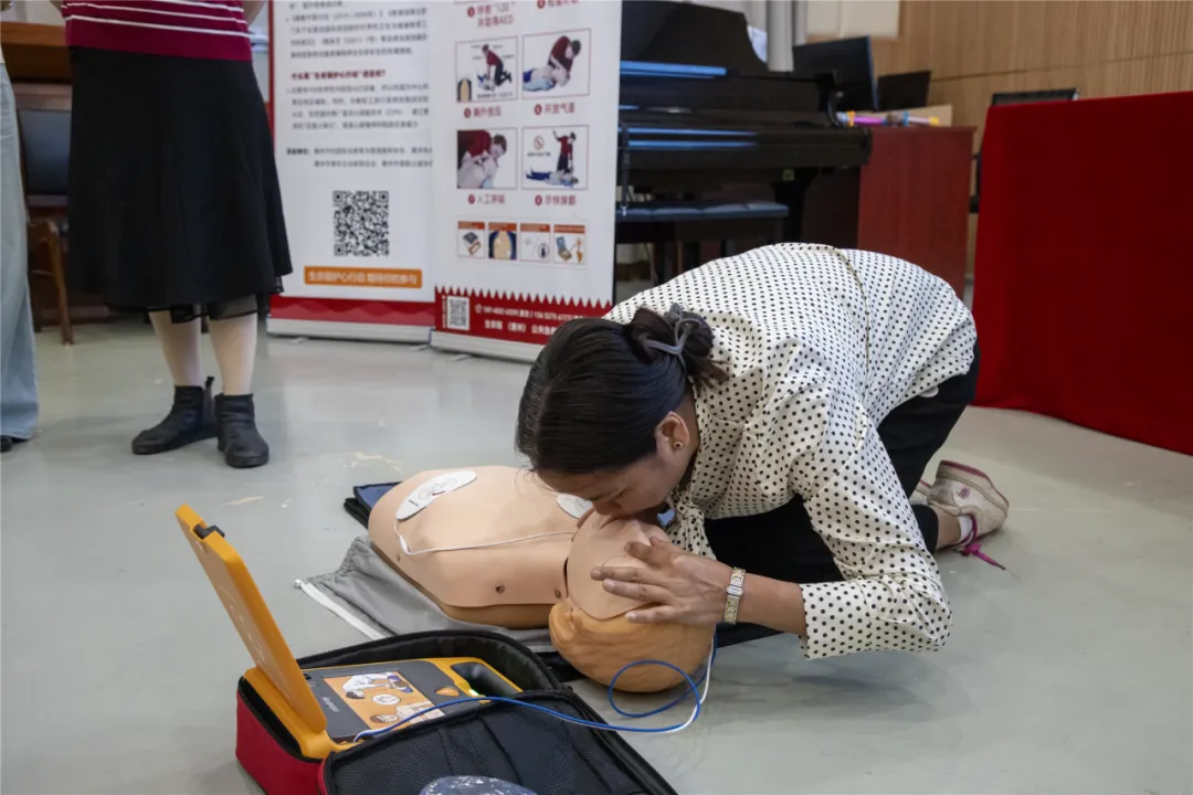 捐赠仪式后,公共急救培训中心专业导师姜大陆为现场教师带来了一场 “干货满满” 的实操课程。培训围绕 “心肺复苏术(CPR)流程”“AED 设备使用步骤”“应急救护黄金时间把握” 等核心内容展开,通过理论讲解、模拟演示、分组实操等环节,让教师们掌握了 “判断意识 – 呼叫急救 – 胸外按压 – 开放气道 – 人工呼吸 – 使用 AED” 的全流程急救技能。
