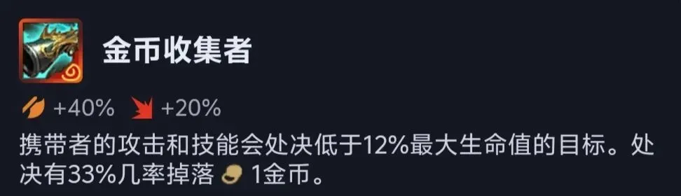 神器金币收集者绝对是输出神器中的天花板存在,自身带12%处决最大的生命值同时有33%几率掉落1金币。不仅可以斩杀敌人的同时还能有概率获得金币,这可以大大的提升我们的阵容上限。