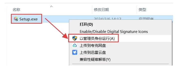 3.选中【Setup】程序,右键点击【以管理员身份运行】。