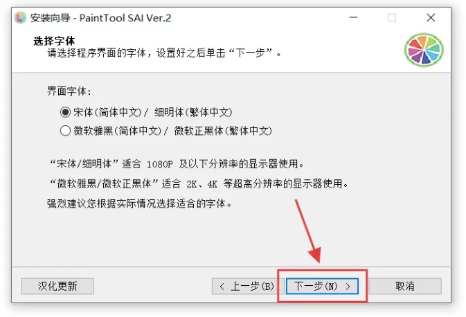 9.选择字体如果显示器是1080P的选择【宋体】,2K或者4K以上的就选择【微软雅黑】然后点击【下一步】。