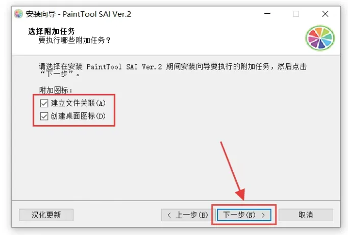 10.附加任务选择勾选【建立文件关联】和【创建桌面图标】,然后点击【下一步】。