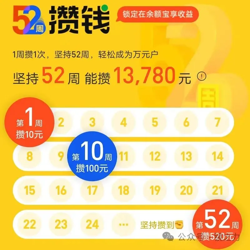 第一周10元,第二周20元,第三周30元…….以此类推,第52周520元。