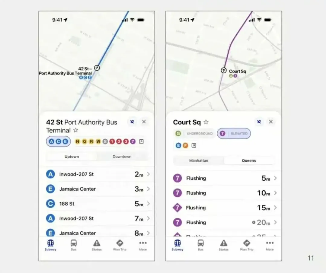 在地鐵方面,新App新增「車站導覽」功能,為乘客提供特定車站內部的動線指引。珍妮佛.陳舉例說,若乘客希望在時報廣場–42街站與港務局巴士總站之間從R線轉乘A線,App會顯示需在地下通道中從百老匯與第七大道一帶步行至第八大道的具體路線。
