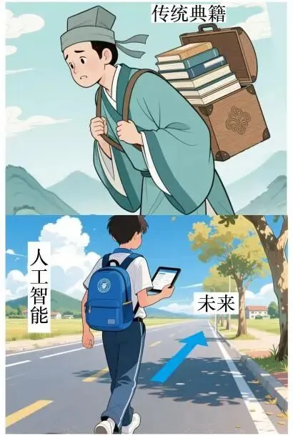 漫画分上下两部分,古代书生背沉重传统典籍,姿态疲惫;现代青年持发光的人工智能平板,昂首轻便。二者皆走向标有 “未来” 的道路,传统典籍是文化根基却有负担,AI 是高效工具,核心探讨求知应承古融今、善用科技。