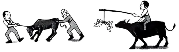 两幅画面对比,左图两人从前后费力拖拽、驱赶一头牛,牛顽固抵抗;右图人骑牛背,以挂青草的长杆在前引导,牛主动前行。从学习角度,前者是被动灌输的低效学习,后者是激发兴趣的主动学习,关键在内在动力。