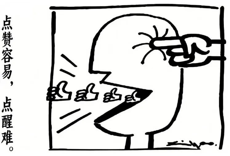 漫画配文 “点赞容易,点醒难”,直击当下社会现象。点赞无需思考与担当,只需迎合虚荣,点醒却要勇气,还易遭抵触,人也常沉溺赞美、拒绝真话。批判浮躁的点赞心态,强调理性点醒的重要性。