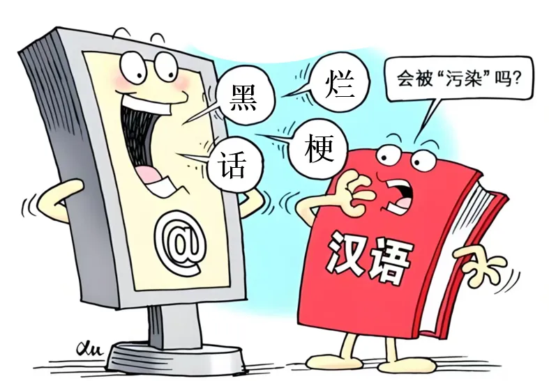 漫画中代表网络文化的符号抛出 “黑话”“烂梗” 等表达,一旁代表传统汉语的形象面露担忧,发出 “会被‘污染’吗?” 的疑问。反映网络语言娱乐化、粗鄙化侵蚀汉语规范,需辩证看待,包容新语亦坚守汉语根脉。