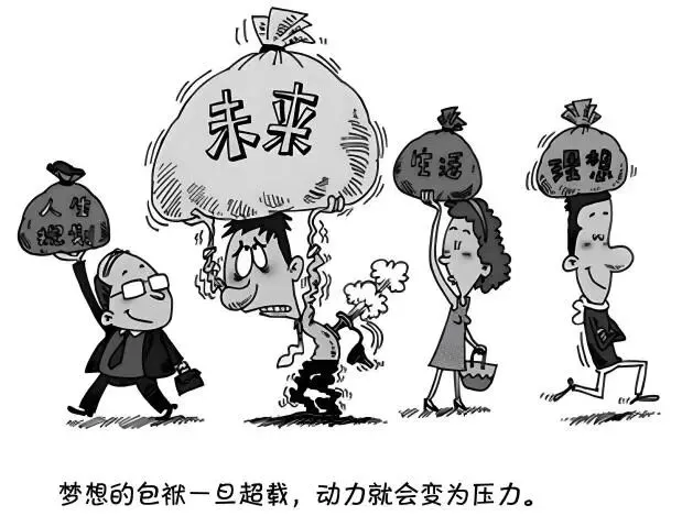 漫画中多人各背标有文字的布袋前行,有人背尺寸合理的 “理想”“生活” 布袋,姿态舒展;一人背超大的 “未来” 布袋,身形佝偻、神情痛苦。配文 “梦想的包袱一旦超载,动力就会变为压力”,揭示追梦需适度承载的道理。