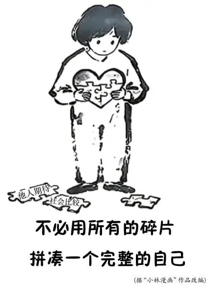 审题:漫画用心形拼图比喻自我,碎片是指他人期待、社会比较等外界定义或自我局限,配文主旨拒绝被定义碎片,自我认知完整自我。完整自我是内在自洽真实,而非要求外界完美,写作可以由漫画引入分析盲从外界的危害,结合青年处境论证坚守自我、辩证取舍碎片的意义,呼吁以本心定义人生。