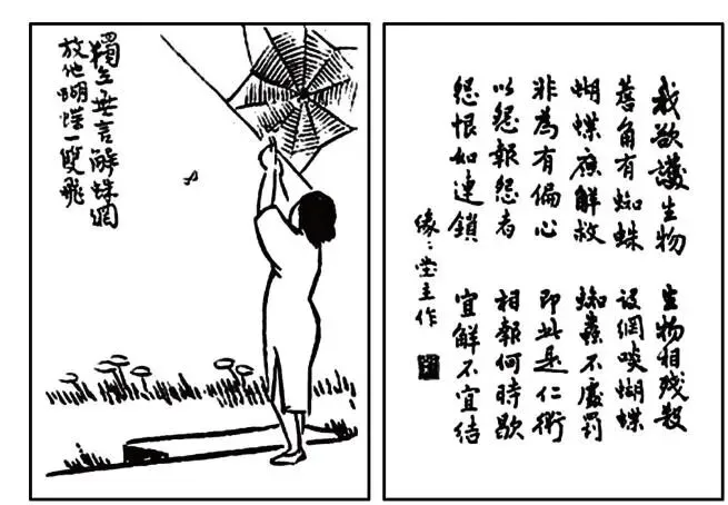 【注】左侧漫画《独立无言解蛛网,放他蝴蝶一双飞》是丰子恺的作品。右侧文字是他为漫画配的诗歌:我欲护生物,生物相残杀。檐角有蜘蛛,设网啖蝴蝶。蝴蝶应解救,蜘虫不处罚。非为有偏心,即此是仁术。以怨报怨者,相报何时歇。怨恨如连锁,宜解不宜结。