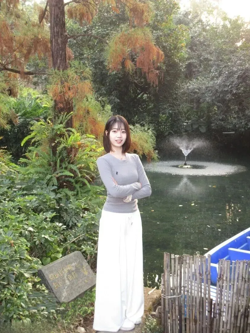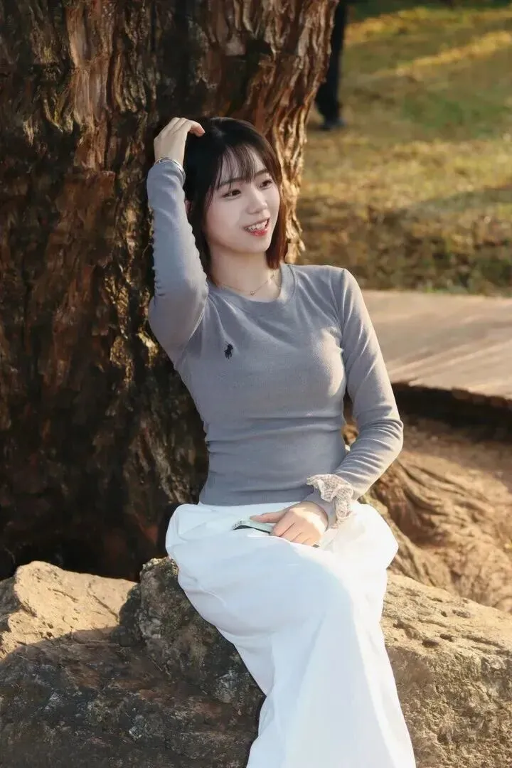 女生坐在石头上笑得格外开心地挥手。针织衫很舒服地贴在身上,白色的裤子线条简单,没有多余的花边。手上佩戴有编织手链、银镯子等饰物的时候才显得有层次。阳光底下看更加治愈。