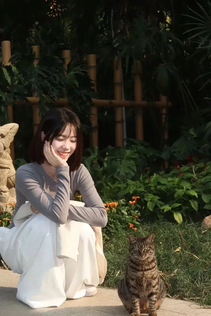 除此之外还有生活化的场景。女生坐在地上逗小猫,身穿针织衫白裙子,从侧面看效果更好。低头笑靥的女子手上有细褶子边,画面定格在一点光暖上。这种搭配适合各种场合穿着,上班或者约会都合适。