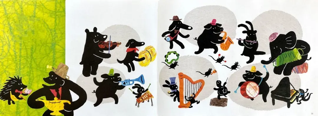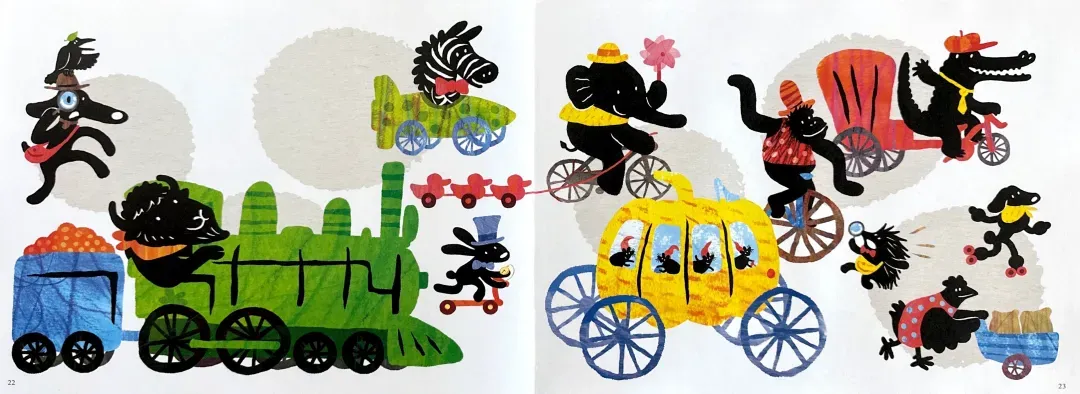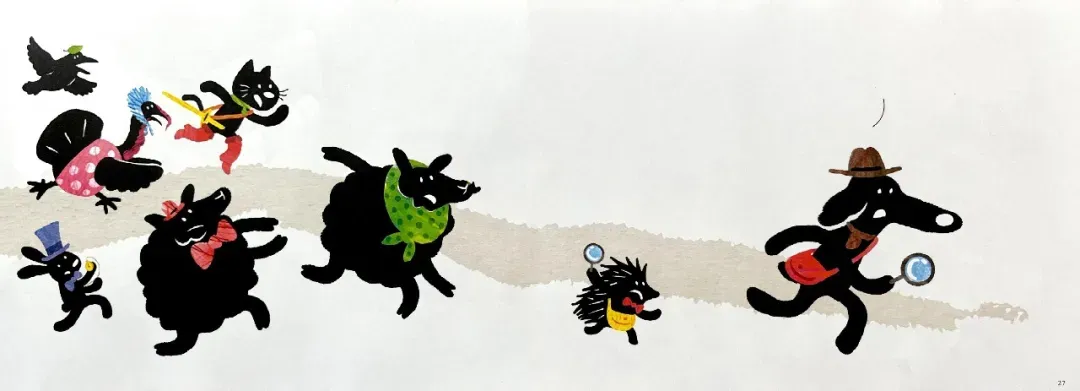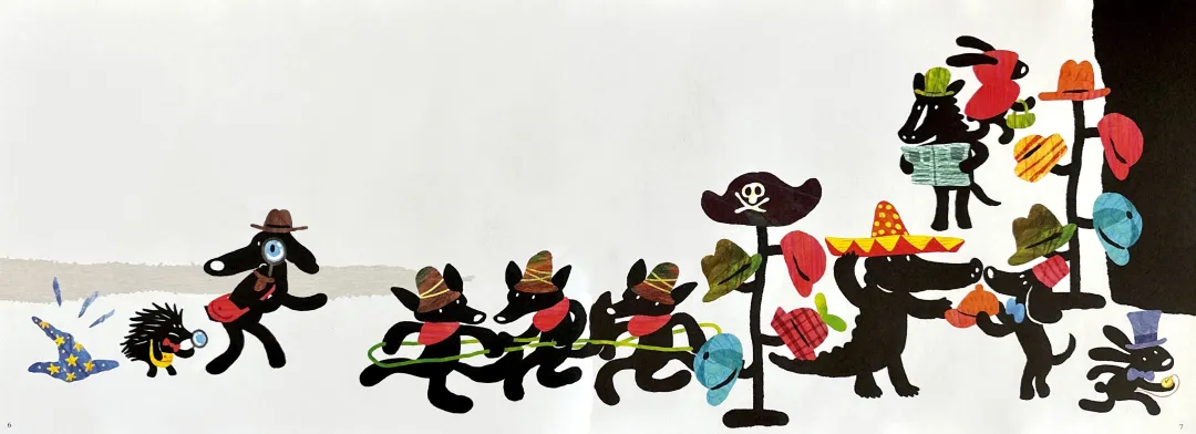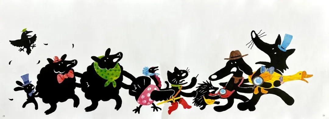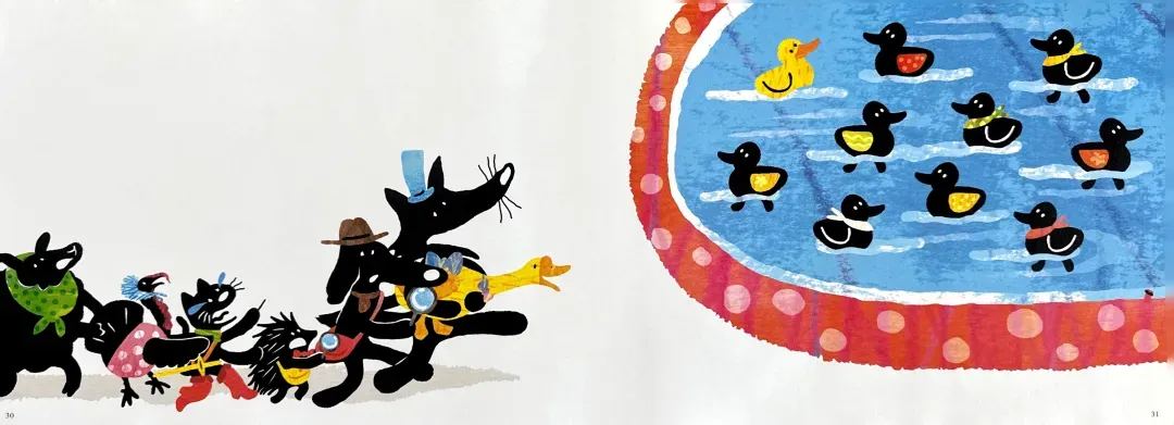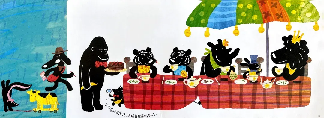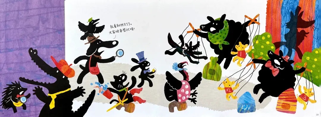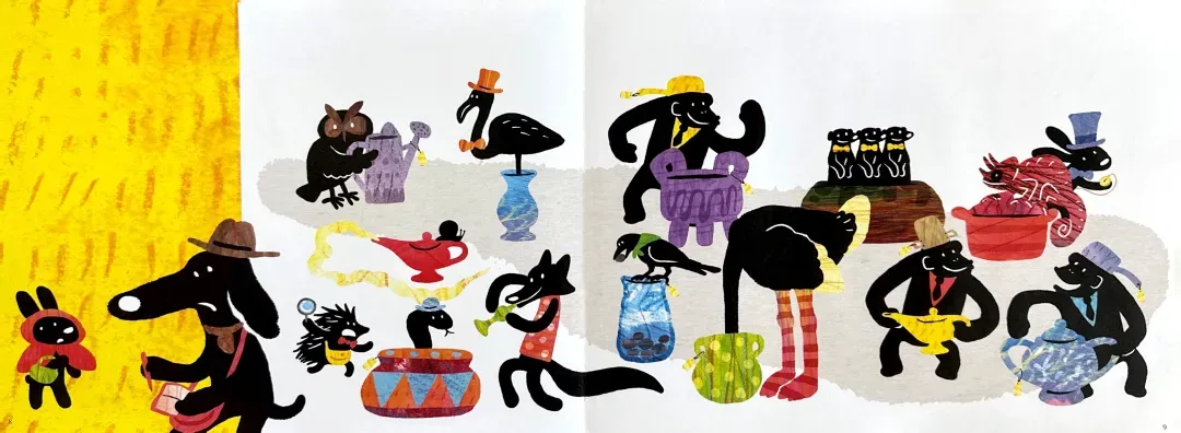 阅读量大的读者不难发现,这本书的内涵及其丰富,每幅画面都暗含了几个中外经典的童话故事,比如:小红帽,乌鸦喝水,变色龙,阿拉丁神灯,鸵鸟政策,匹诺曹的长鼻子,七只小羊的故事,灰姑娘的南瓜马车…… 如果能读懂这些内涵,阅读的乐趣就更大了。假如没有相应的阅读背景,可以以这个故事为抓手,把相关联的经典故事找来读一读,孩子们一定会很喜欢的。