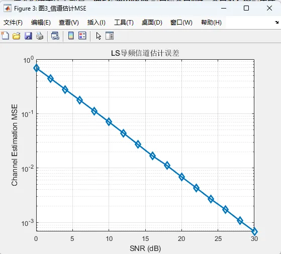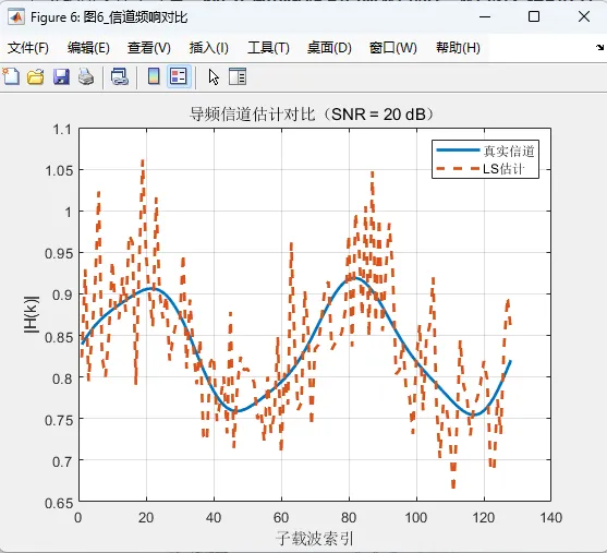 在通信接收端,系统完成了从接收信号恢复数据的完整处理链。接收信号首先经过循环前缀去除和 FFT 变换,由时域重新回到频域。由于实际链路中存在频率选择性衰落和噪声影响,接收端需要利用导频信息对信道进行估计。本系统采用了基于导频的频域信道估计方法,通过比较已知发射导频与接收导频之间的关系,获得各子载波上的信道响应估计值,并进一步扩展到数据符号所在的资源网格。完成信道估计后,系统对数据子载波执行均衡处理,从而尽可能消除信道衰落带来的幅度和相位畸变。在均衡之后,数据符号被送入判决模块完成解调,最终恢复出接收比特流,并与原始发送比特进行比较,计算误码率。为了更全面地评估链路性能,系统除误码率外,还进一步计算了可达速率和信道估计均方误差等指标。误码率用于反映系统在不同信噪比条件下的信息恢复准确性,可达速率用于体现信道容量和传输效率,信道估计均方误差则反映导频估计与真实信道之间的接近程度。通过这三个指标的联合观察,可以较为全面地分析通感一体化系统在通信侧的性能表现。