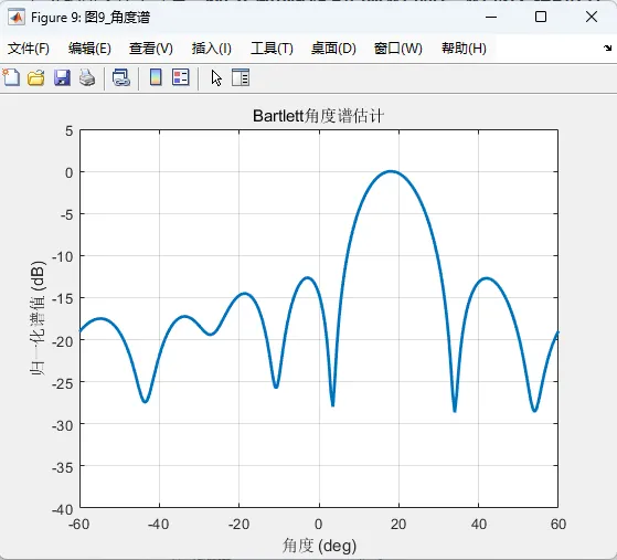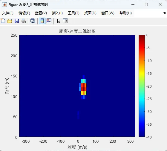 在感知处理端,系统重点围绕目标距离估计、速度估计和方向估计展开。由于 OFDM 信号在频率维度上具有多个子载波,目标回波在不同子载波之间会表现出与传播时延相关的相位变化,因此可以通过对回波进行频域逆变换或相关处理,形成距离像,从而估计目标距离。与此同时,由于同一目标在多个 OFDM 符号之间会引入稳定的多普勒相位演化,因此系统可以在慢时间维上进行傅里叶分析,得到目标的多普勒信息,进一步形成距离-速度二维谱图。该二维图能够较直观地给出目标所在的距离单元和速度单元,是通感一体化系统感知性能展示中最有代表性的结果之一。对于角度估计,本系统利用接收阵列的空间采样能力,通过阵列流形构造波达方向估计模型,并采用 Bartlett 波束形成谱作为方向搜索手段。虽然 Bartlett 方法在分辨率上不如更高阶的超分辨算法,但其结构清晰、实现稳定、对样本协方差矩阵要求较低,适合作为毕业设计级工程系统中的基础角度估计方案。通过对角度谱峰值的搜索,可以较直观地恢复目标来波方向,从而完成感知链路的最后一个关键维度估计。