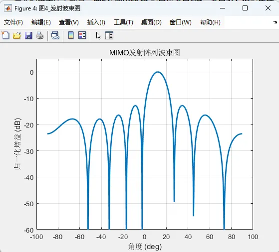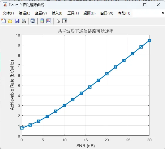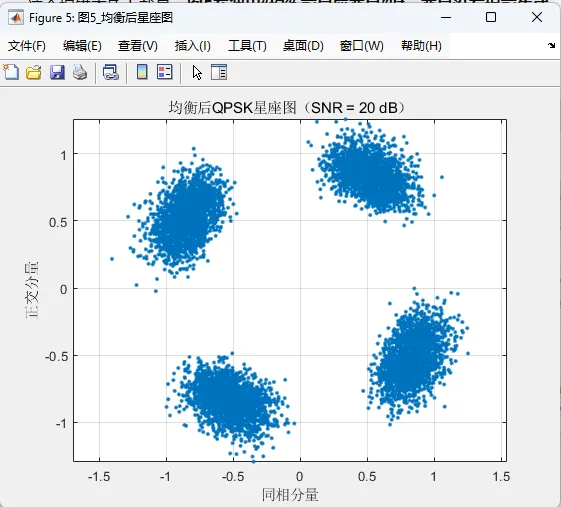 为了验证系统设计的有效性,本研究在 MATLAB 2024a 平台下实现了完整仿真,并给出了多幅具有代表性的结果图。首先,误码率曲线展示了系统在不同信噪比下的通信可靠性变化趋势,通常随着信噪比提高,误码率逐渐下降,这说明在合理的信道估计和均衡条件下,系统具备较稳定的数据恢复能力。其次,可达速率曲线反映了系统频谱效率随信噪比或信道条件变化的规律,说明多天线与 OFDM 结合后能够获得较好的容量提升效果。再次,信道估计均方误差曲线表明随着信噪比提高,估计精度逐步改善,从侧面说明导频设计和估计算法能够有效支撑后续均衡处理。除此之外,均衡前后星座图对比能够直观反映信号在信道衰落和噪声影响下的畸变情况,以及均衡后符号聚集程度的改善。发射波束图则展示了阵列在特定方向上的能量集中能力,说明系统具备明确的空间指向性。距离像、距离-速度二维谱图和角度谱共同构成了感知性能的核心展示结果,其中距离像用于目标距离定位,二维谱图用于联合估计目标距离与速度,而角度谱则实现目标方位识别。这些图形结果相互配合,使系统性能不再局限于单一指标,而是形成了较完整的通信与感知双功能评估体系。