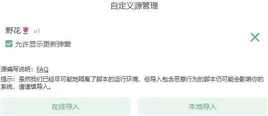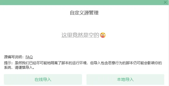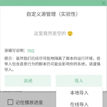 5、自定义源,这是其中最重要的,也就是为这个播放器添加加音乐源,点击它,在弹出的界面中可以选择在线导入和本地导入