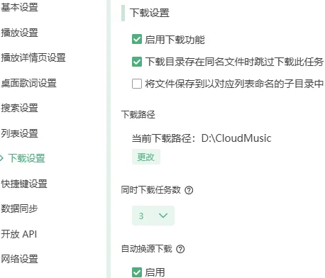 8、先不看音乐播放,继续看设置。进入下载设置,可以点选启用下载功能,这样就能下载歌曲了。再就是给自己的歌曲设定一个下载文件夹。如果你有多个音乐源,可以在自动换源下载中,点击启用,这样当你选定的源中歌曲无法播放时,它会自动切换源进行播放