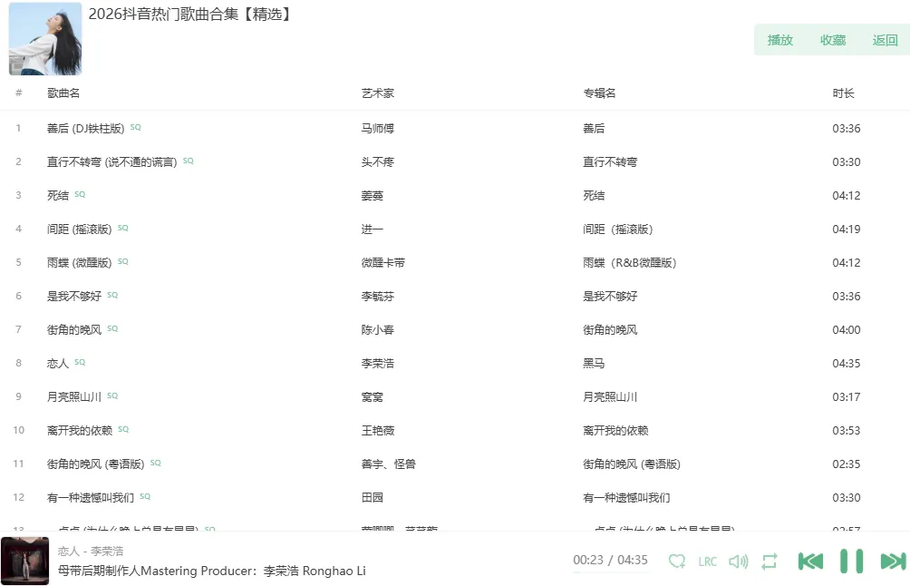 11、随便打开一个合集,这样歌曲就显示在列表中,点击右上角的播放就是从头开始播放,或者双击其中某首歌曲,也可进行单曲播放