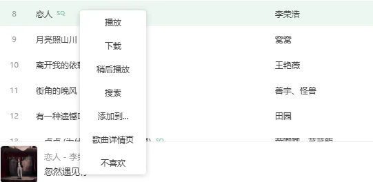 12、当想下载哪首歌曲时,只需要在歌曲上右键即可显示菜单,点击下载,会显示当前歌曲的音质,可以进行选择或者默认下载都可