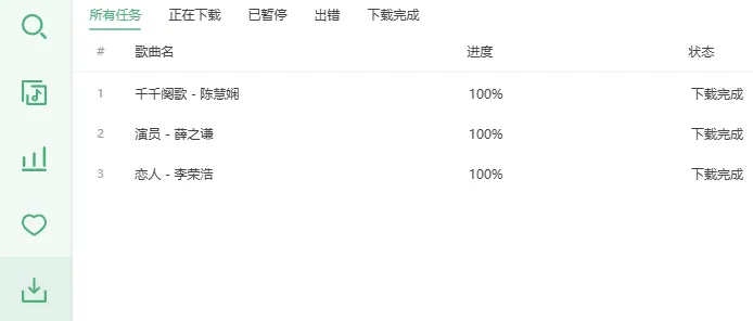 13、下载完成,即可在左边菜单栏下载项中,显示你已经下载的歌曲,并且可以在最初设定的下载文件夹中查看