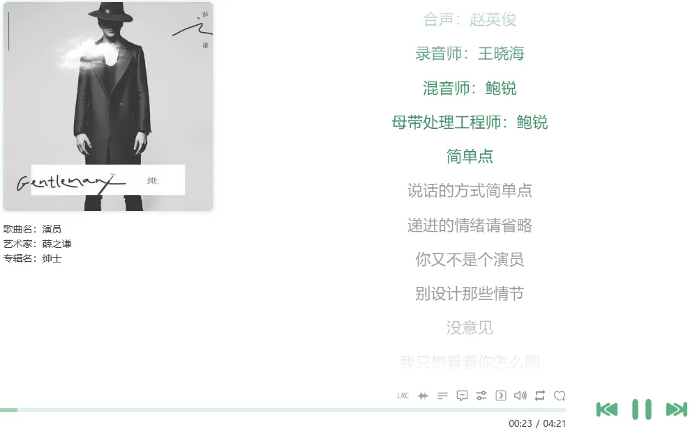 14、点击下方正在播放的歌曲,即可显示这首歌曲的专辑名,歌曲名,演唱者,并且在右边显示同步歌词,当拖动歌曲进度,歌词也会同步