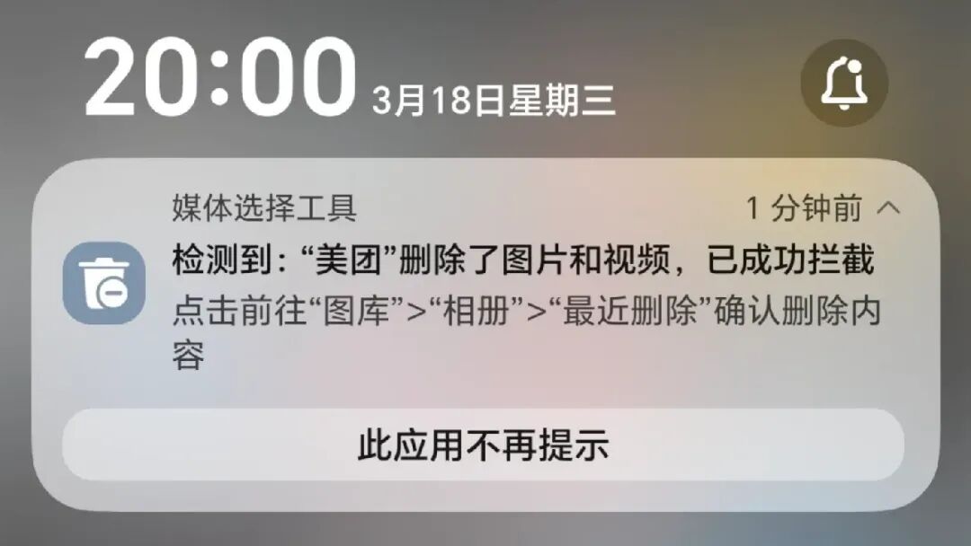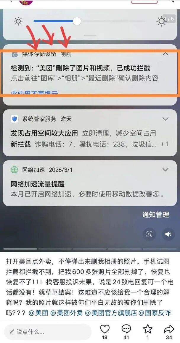 3月18日起,多名安卓用户在社交平台反映,使用美团App时遭遇相册文件被批量删除。一名网友发布的系统截图显示,手机弹出“检测到:‘美团’删除了图片和视频”的提示,该用户称:“打开美团点外卖,不停弹出来删我相册的照片,手机试图拦截都拦截不到,把我600多张照片全部删掉了,恢复也恢复不了!”类似遭遇并非个案。重庆一位华为用户发帖控诉,自己手机里1314张照片被美团全部删除。北京一位用户表示,近3000张照片被永久销毁,即便联系工程师协助,也未能恢复。四川一位用户则称,6年里拍摄的照片、视频、音频被一次性清空,最后在回收站只找回约100张照片,“剩下的视频音频彻底没了”。