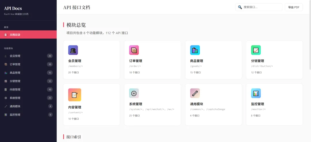 在这次若依项目的 API 文档生成中,我采用了**“索引先行 + 模块切分”**的策略: