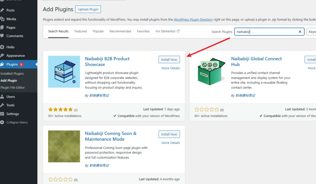 在WordPress后台插件仓库搜索”naibabiji“即可找到它啦!