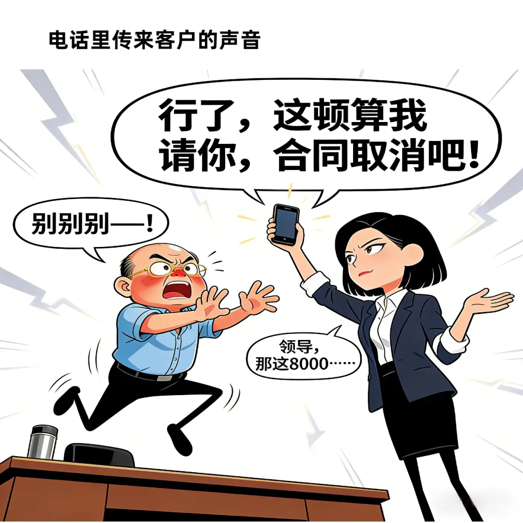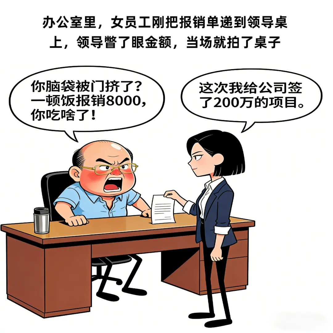 趣味漫画:办公室里,女员工刚把报销单递到领导桌上,领导:一顿饭找我报销8千,你吃啥了,女:这次我给公司签了200万的项目…