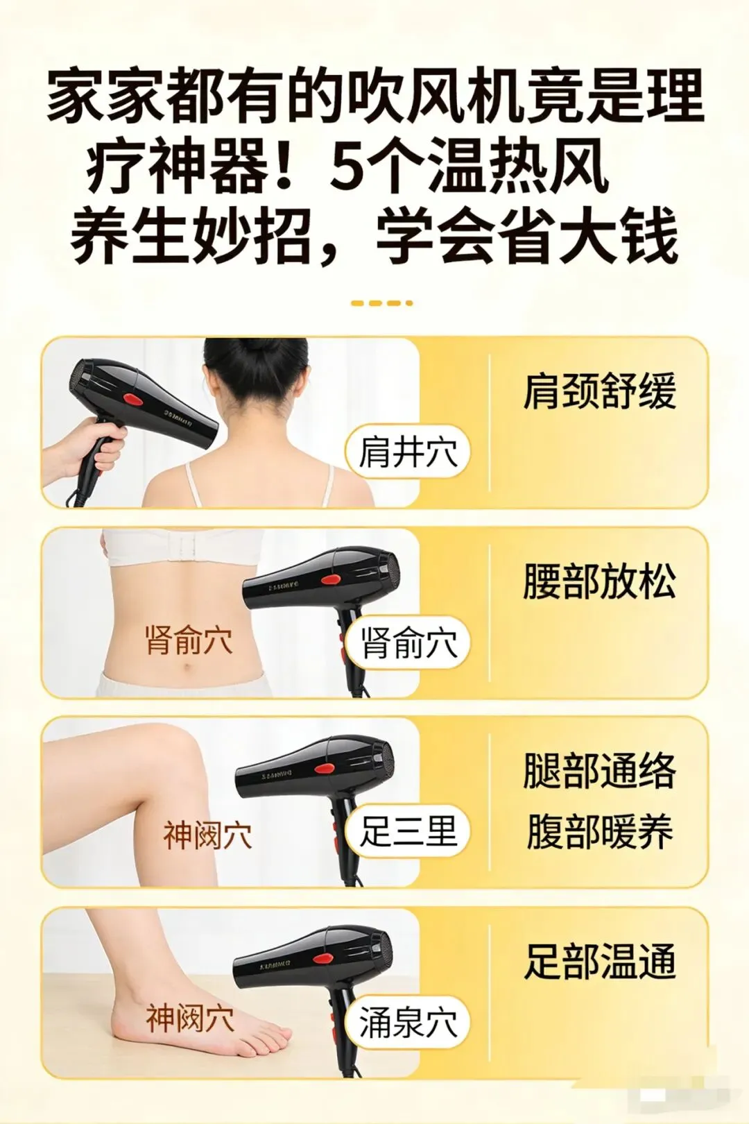 家家都有的吹风机竟是理疗神器!5个温热风养生妙招,学会省大钱