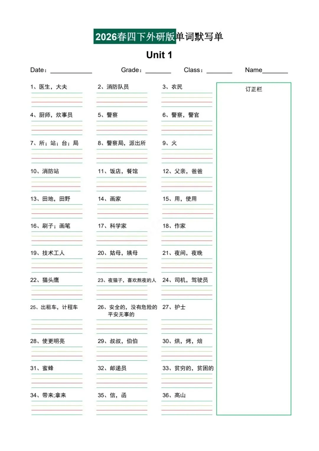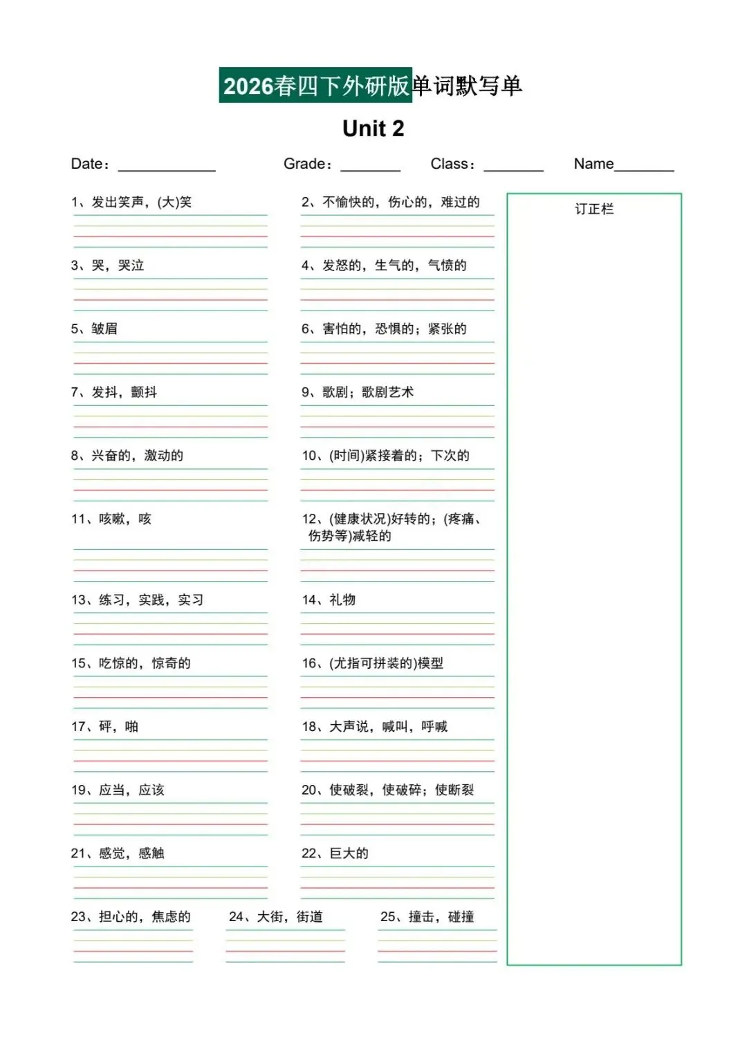 2026年春四年级下册外研版(三起点)单词默写单,可电子版下载打印.