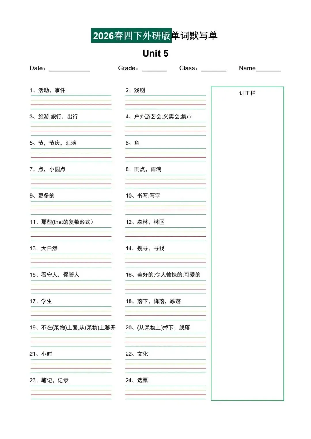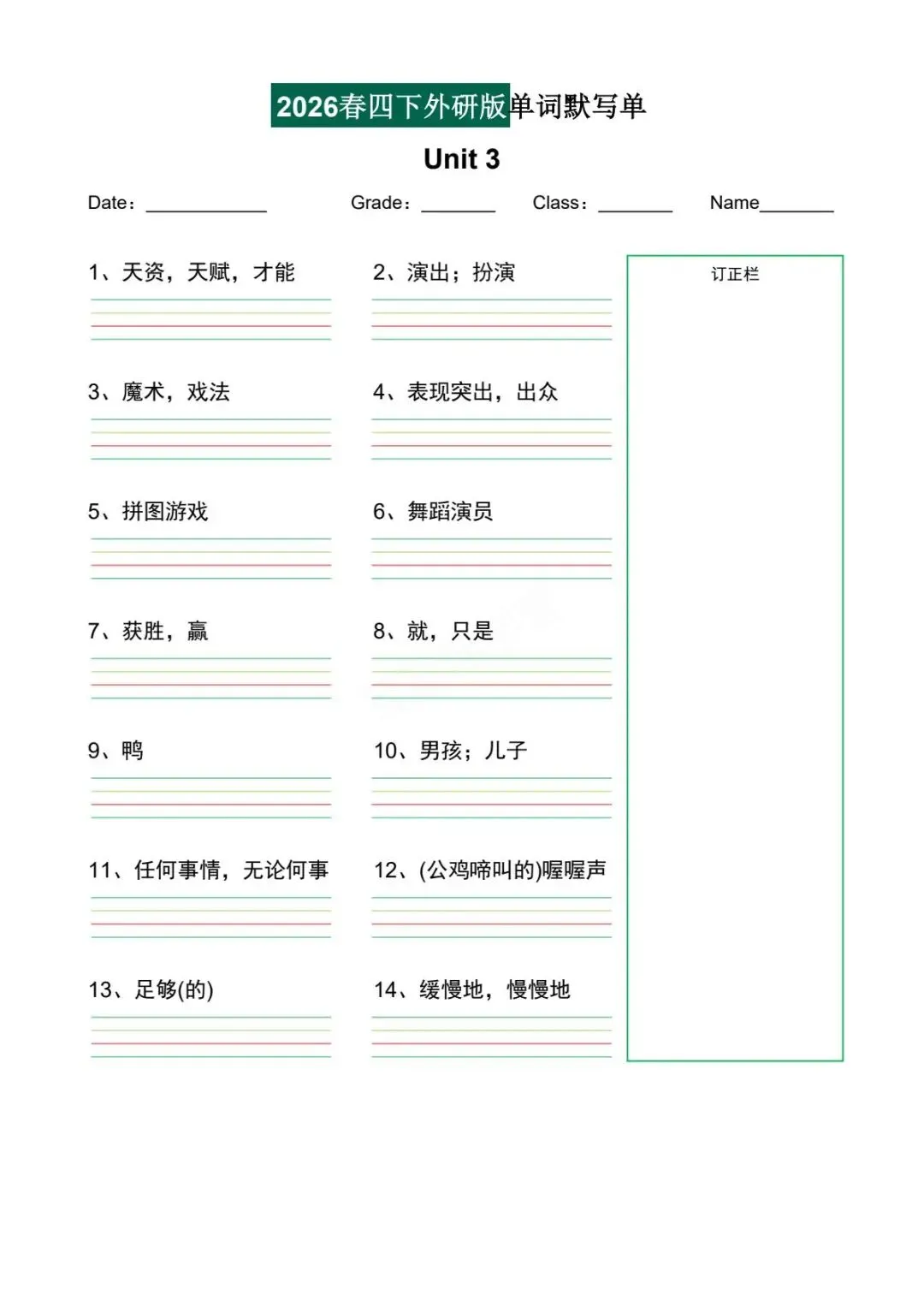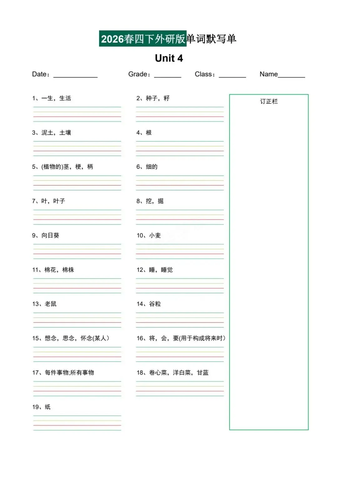 今日课代表给大家分享的是:2026年春四年级下册外研版(三起点)单词默写单,可电子版下载打印。
