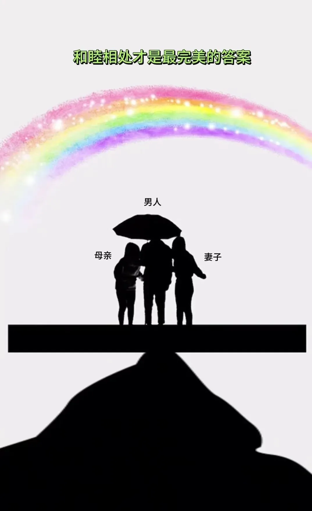 我们总习惯在家庭里争对错、分主次,却忘了家从来不是辩场,而是讲爱的港湾。漫画的最后,风雨散去,彩虹高悬。男人不再执着于“二选一”的困局,而是撑开一把大伞,将母亲与妻子一同护在身下。三人并肩而立,没有了推搡与对立,只剩下彼此的依靠与陪伴。