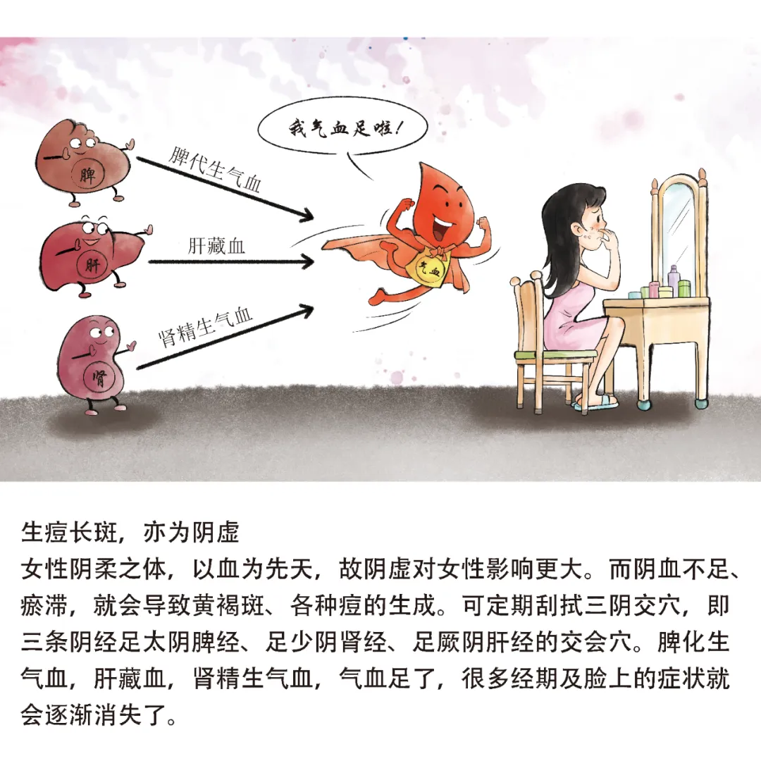 女性阴柔之体,以血为先天,故阴虚对女性影响更大。而阴血不足,瘀滞,就会导致黄褐斑,各种痘的生成。可定期刮拭三阴交穴,即三条阴经足太阴脾经,足少阴肾经,足厥阴肝经的交会穴。脾化生气血,肝藏血,肾精生气血,气血足了,很多经期及脸上的症状就会逐渐消失了。