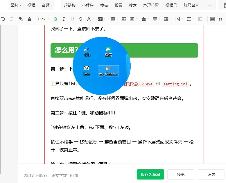 它的功能就一句话:按住键盘左上角的 ` 键(Esc下面那个),鼠标就能直接穿透当前窗口,操作被挡住的桌面或文件夹。松开就恢复正常。