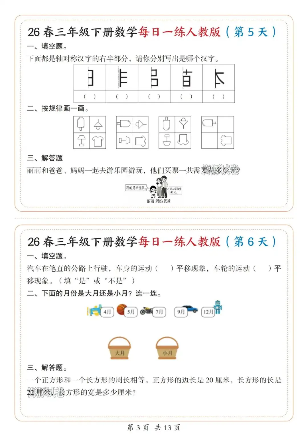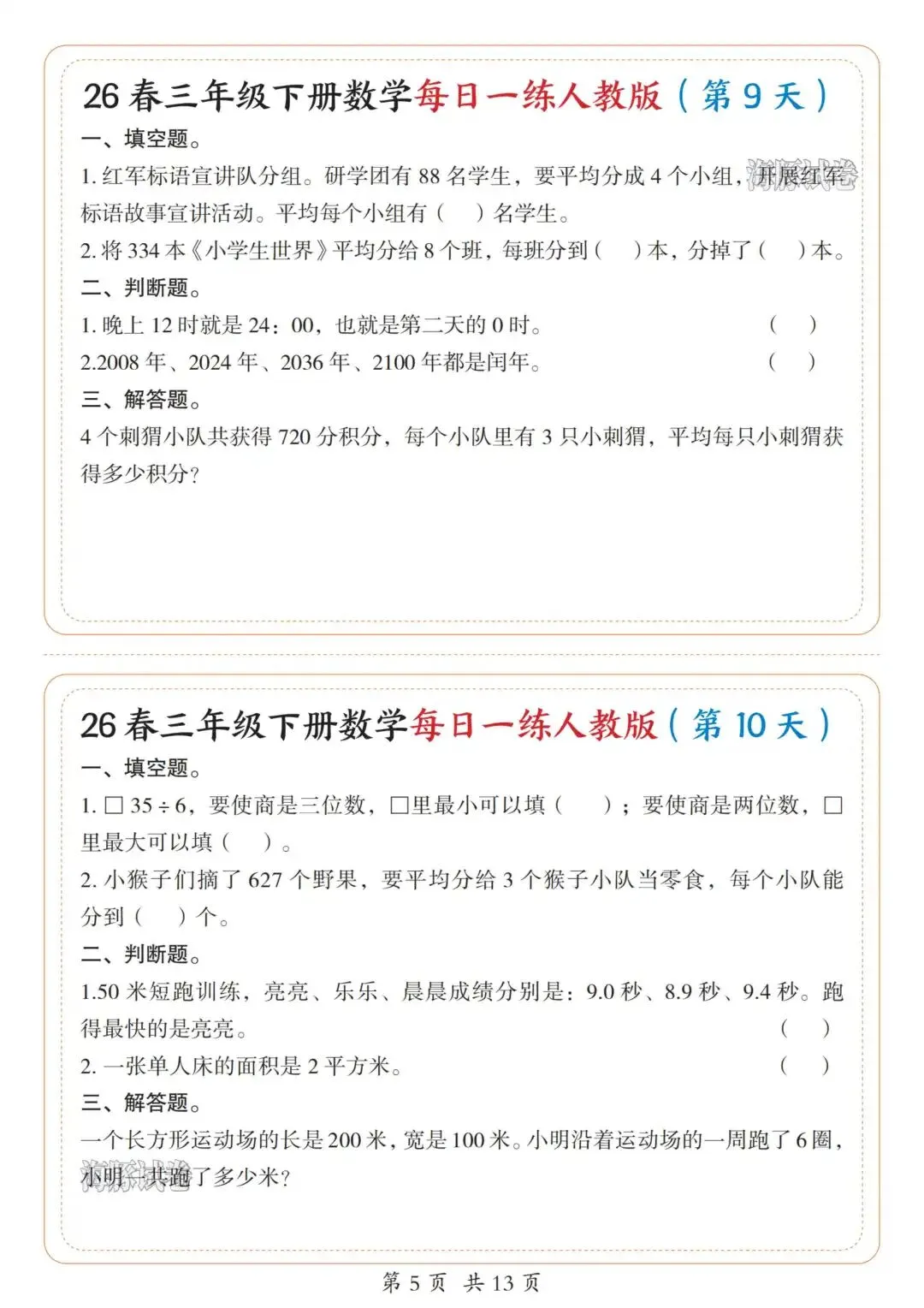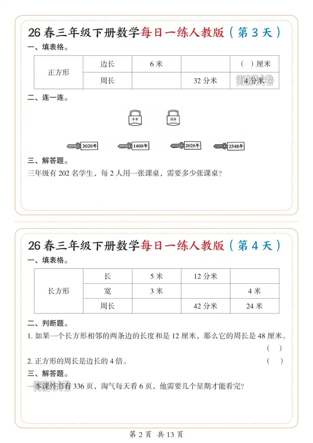 今天涵涵的学霸日记给大家分享的是26新版三年级下册数学每日一练人教版,完整版13页