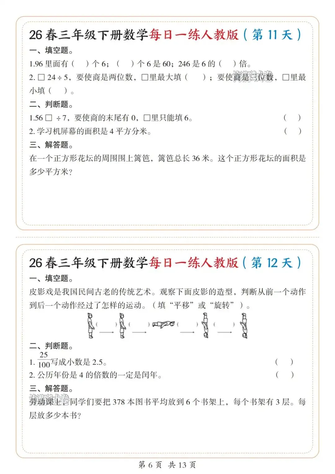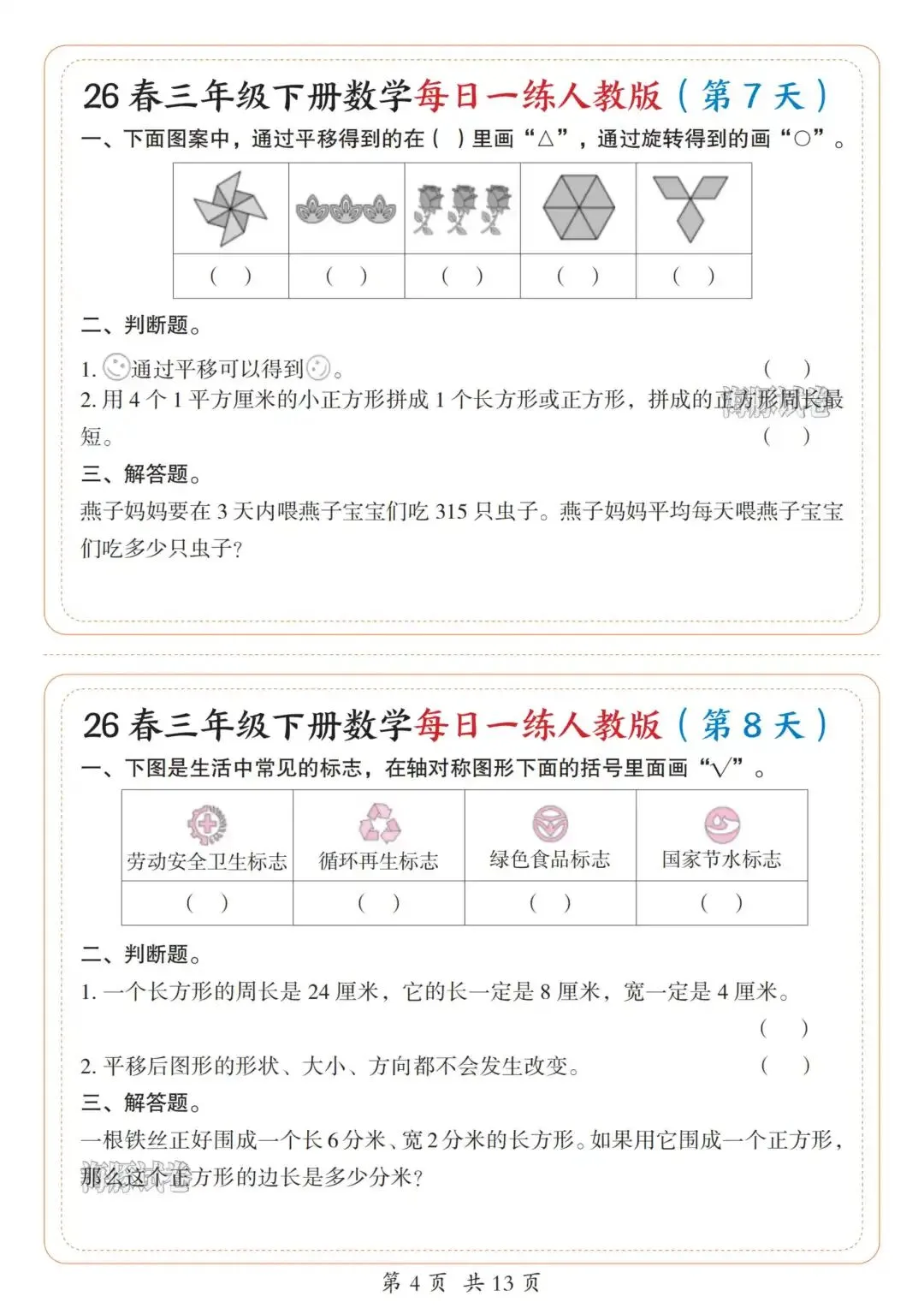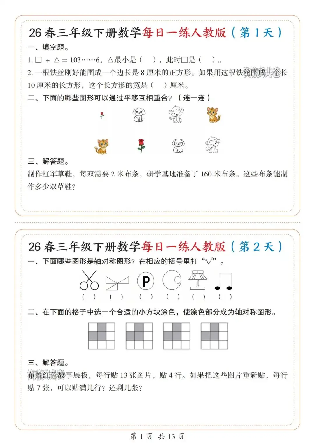 今天涵涵的学霸日记给大家分享的是26新版三年级下册数学每日一练人教版,完整版13页