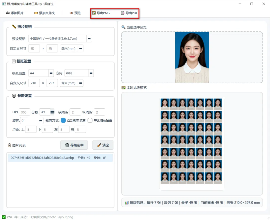 照片规格:支持预设规格(如中国证件照)或自定义尺寸