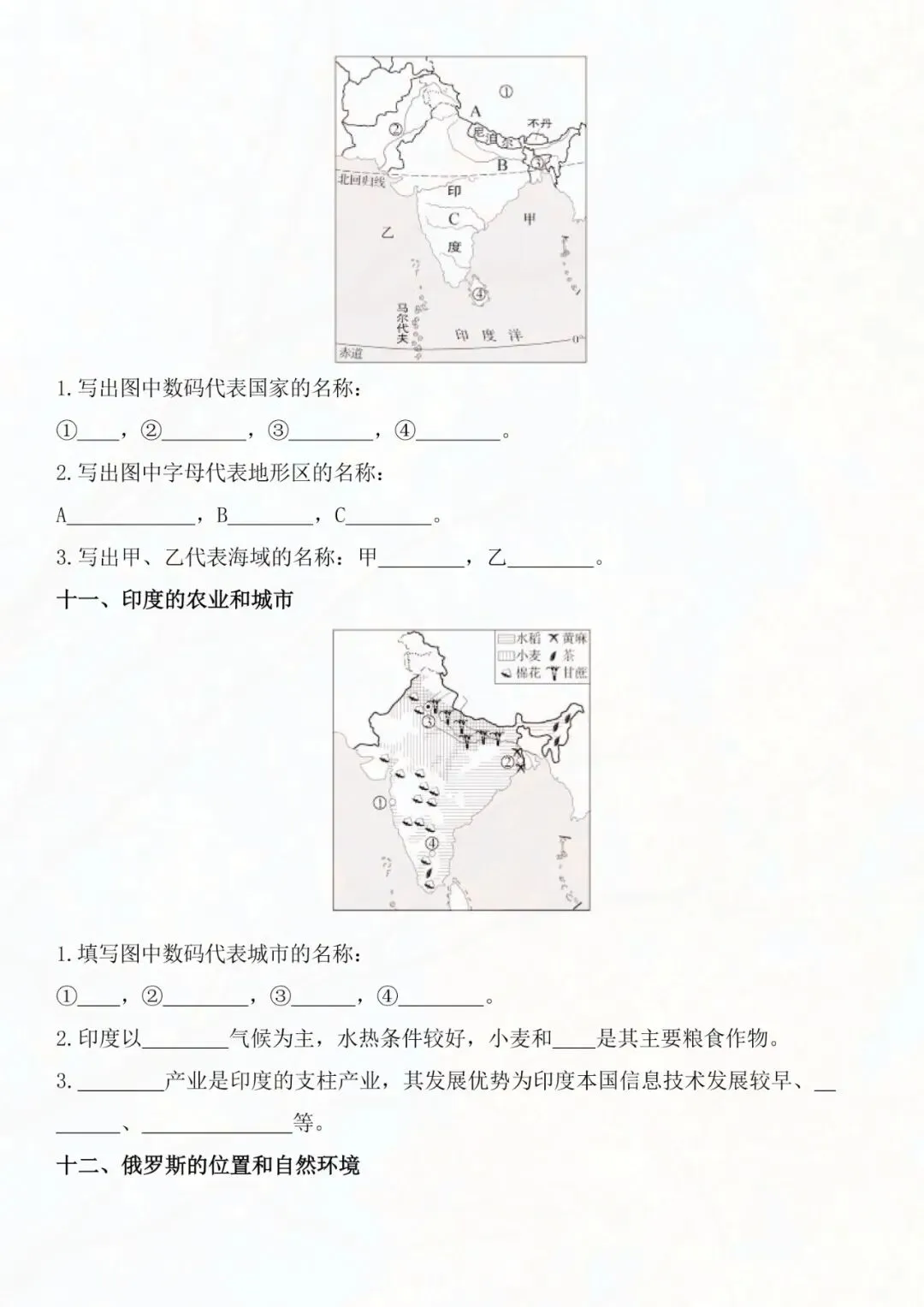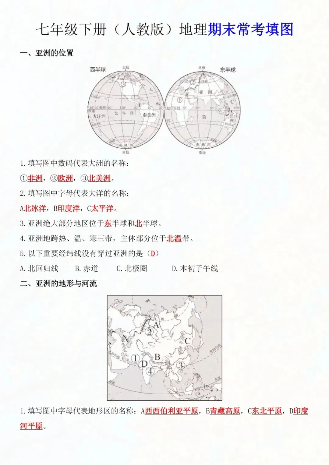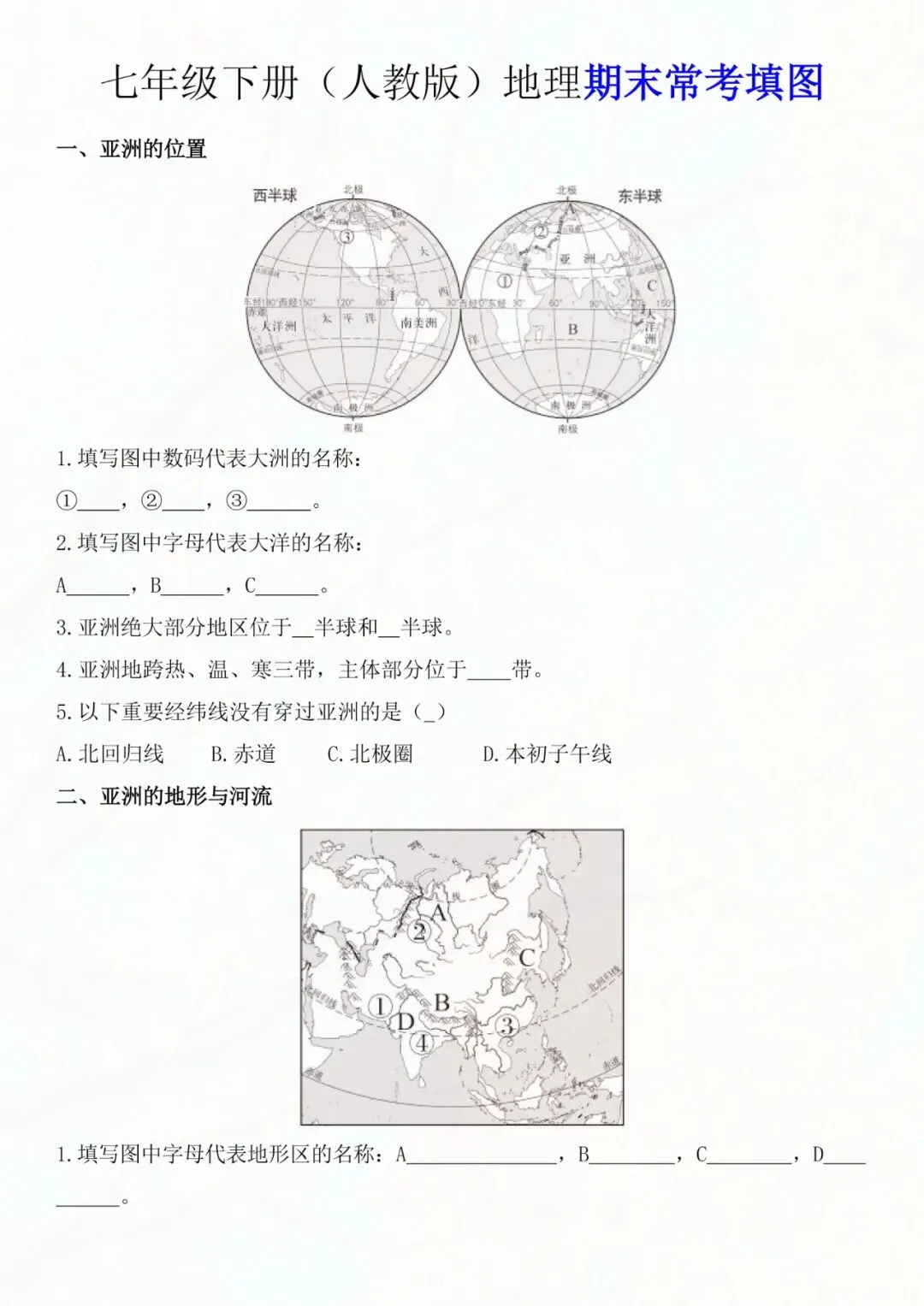 今天老师给大家整理了:七年级下册地理期末常考填图填空版电子版可打印!