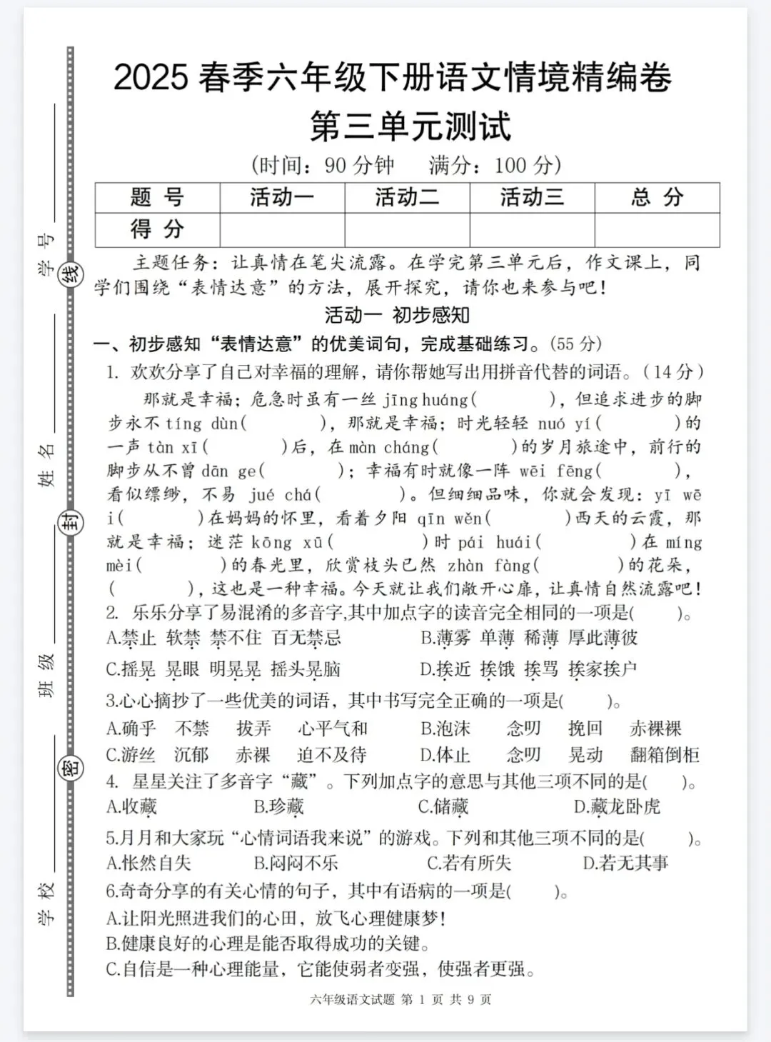 部编版六年级上册语文《第一单元情境精编卷》,带答案,电子版可打印,1-6年级各单元都有